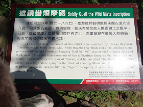 虎字碑,新北市貢寮區草嶺古道,為清代台灣鎮總兵劉明燈於清穆宗同治六年:1867年所書;於1985年8月19日公告為國家三級古蹟;碑之左側,有甲骨文字樣,經過釋譯,內文為「登此嵯峨,西望我鄉。哀哉我鄉,赤炎(燄)為禍」;碑之右側,有一個意義不明的圖形,不知何解,判斷為蓄意之刻記 ..... 親臨目睹,依然字體,丰采依舊 .....