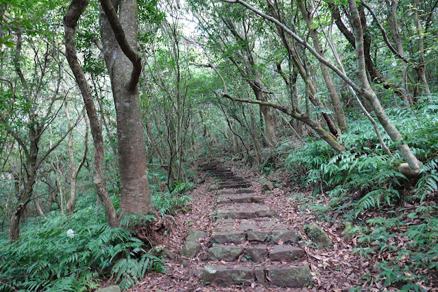 當不需要太多語言描繪接下來的行程,默默的開始接受連串的不規則鋪排的山徑,一路從山上走向山下,每一步都是一種無法用語言描述的驚喜,我會說,因為沒有需要,只需用雙腳去體會這段旅程,擴展這特殊的體驗,下山的路徑蜿蜒,像一條無形的絲帶,沿途的風景不斷變換,像一幅幅美麗的畫卷,在我眼前徐徐展開,高大的樹木,茂密的灌木叢,無窮的陡下山徑,陡再陡的環境,走的有些絕望 ....